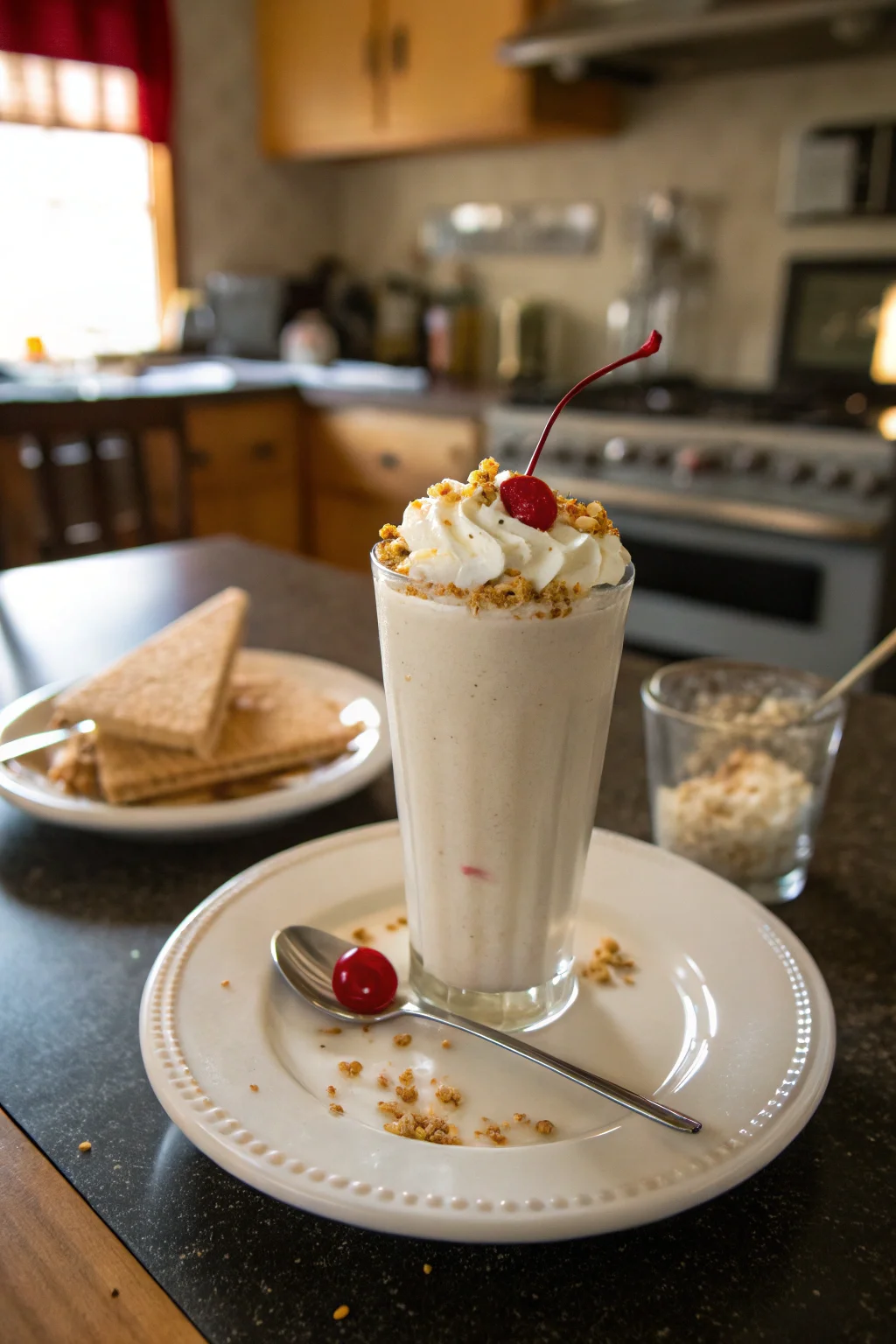 3. Pour into glasses. Top with whipped cream, sprinkle with extra graham cracker crumbs, and don’t forget the cherry. It’s the little hat that makes it all feel fancy.