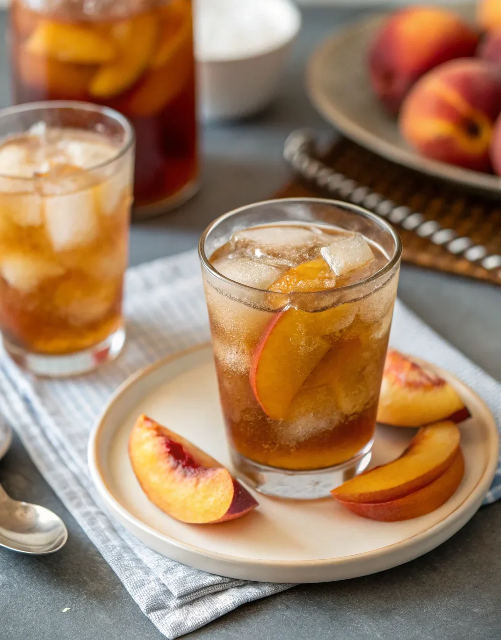 - Serve the Peach Whiskey Iced Tea over ice, garnished with peach slices and mint leaves.